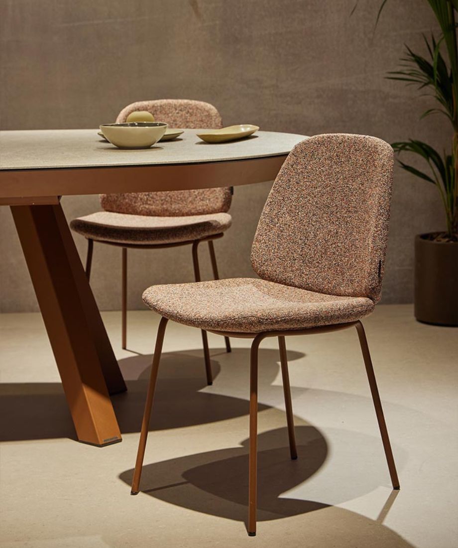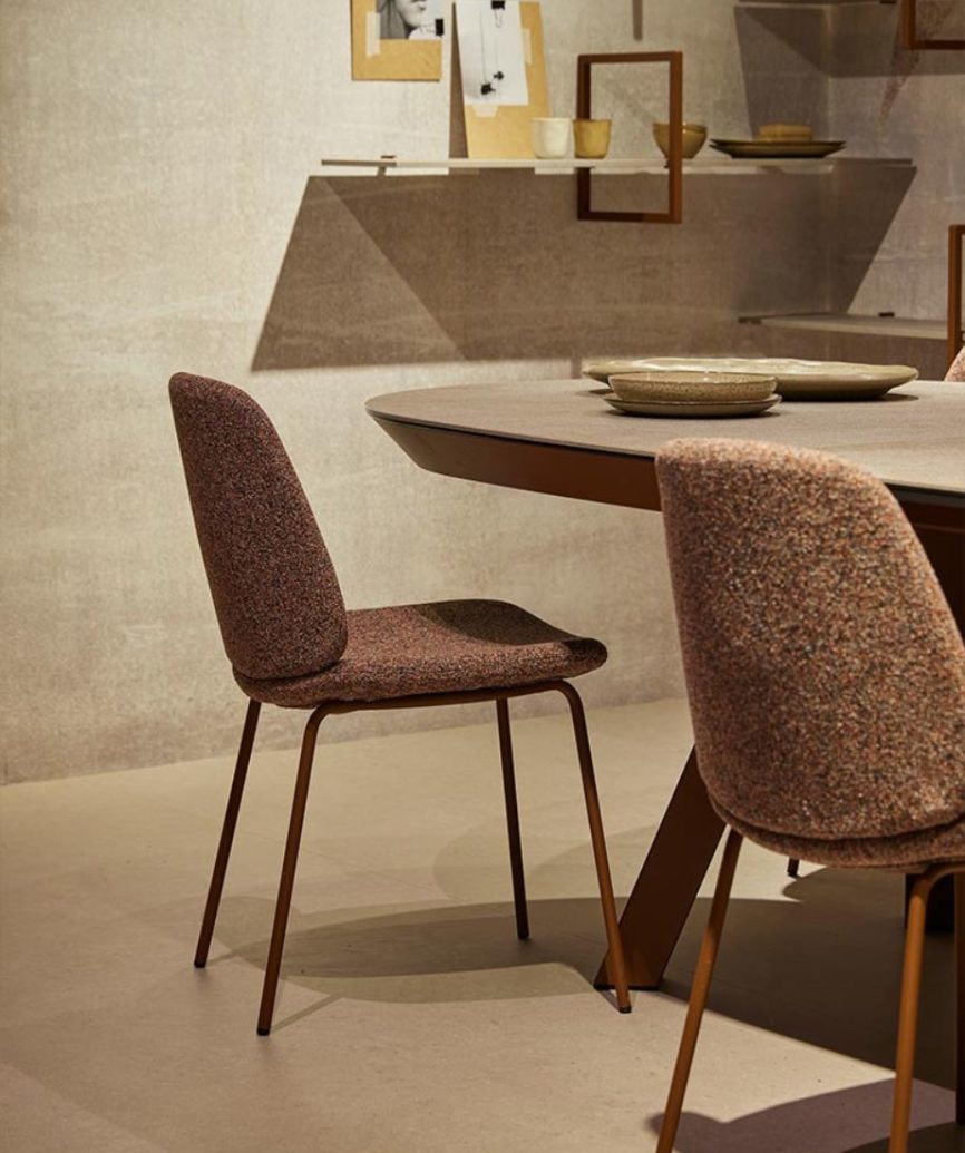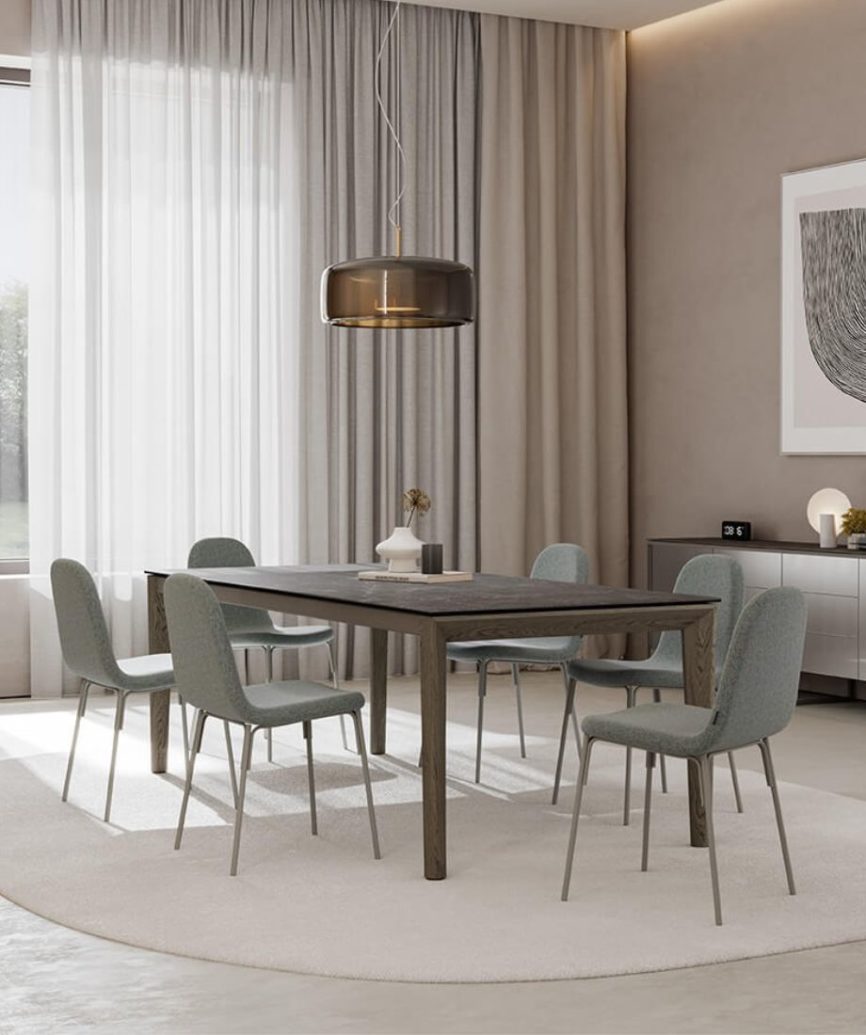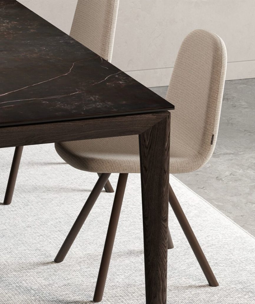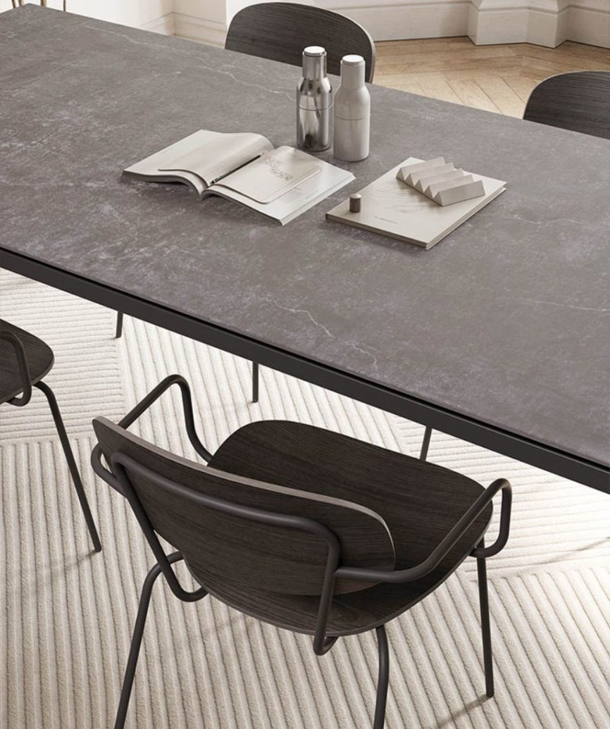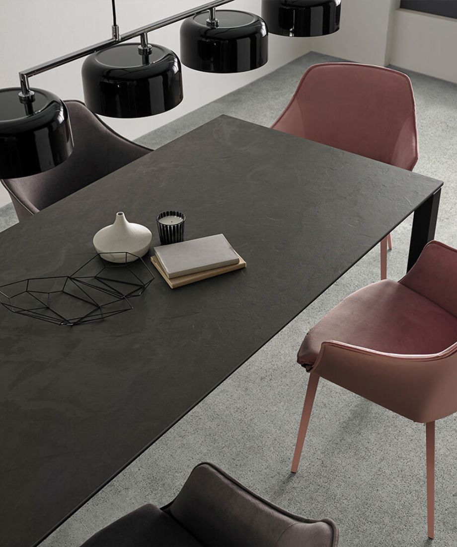 Table de pied central avec plateau céramique laminé avec du verre disponible en trois hauteurs différentes et en 28 mesures. Les mesures offertes sont rectangulaires et carrées. Dans le cas des références 587-589-590, les tables ont deux colonnes.