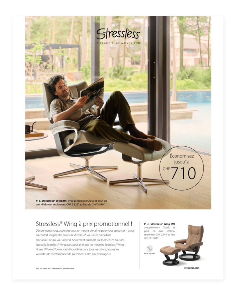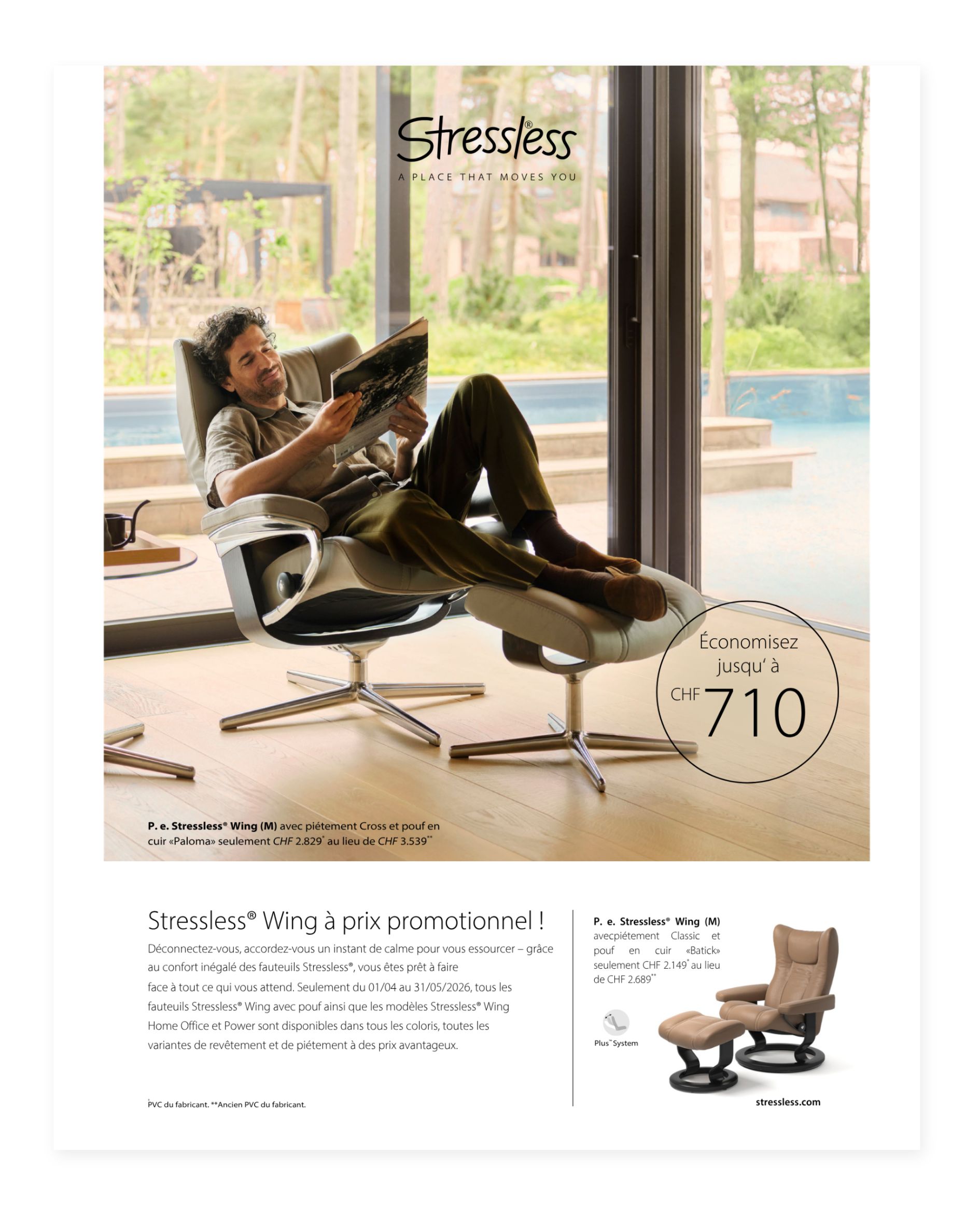 Du 1er avril au 31 mai 2026, découvrez le fauteuil iconique Stressless® Wing, reconnu pour son design intemporel et son confort incomparable.